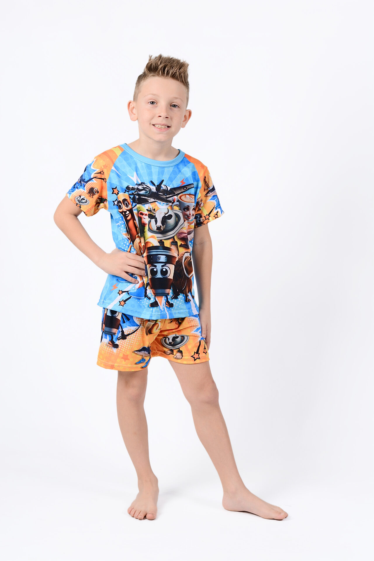 Pijama infantil corto temporada Primavera/Verano confeccionado en Modal Soft importado de primera calidad. Hilos a tono. Suave a la piel. No se achica. No se deforma. No pierde color. No da alergia.  Talles amplios. Se entregan embolsados y perfumados. Diseños propios y exclusivos de la marca. El tono del envivado puede variar.